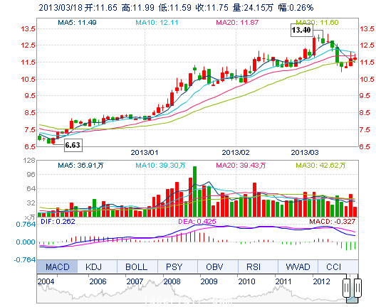 | 今 開: | 11.65 | 成交量: | 24.15萬手 | 振 幅: | 3.41% |