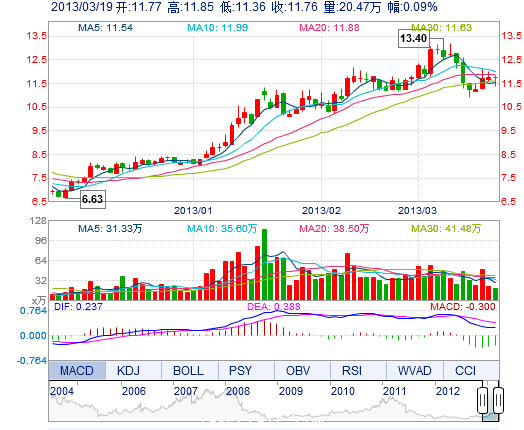 今 開: 11.77 成交量: 20.47萬手 振 幅: 4.17% 最 高: 11.85 成交額: 2.38億元 換手率: 2.16% 最 低: 11.36 總市值: 122.82億 市凈率: 3.79 昨 收: 11.75 流...
