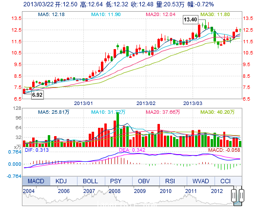 | 今 開: | 12.50 | 成交量: | 20.53萬手 | 振 幅: | 2.55% |