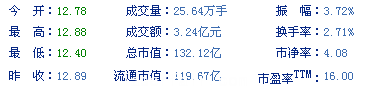 今開: 12.78 成交量: 25.64萬手 振幅: 3.72% 最高: 12.88 成交額: 3.24億元 換手率: 2.71% 最低: 12.40 總市值: 132.12億 市凈率: 4.08 昨收: 12.89 流通市值...