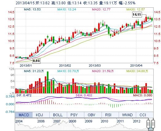 今開: 13.62 成交量: 19.11萬手 振幅: 4.82% 最高: 13.80 成交額: 2.55億元 換手率: 2.02% 最低: 13.14 總市值: 139.43億 市凈率: 4.31 昨收: 13.70 流通市值...