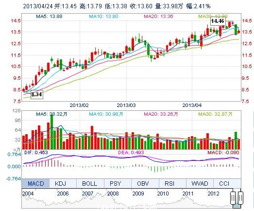 | 最 高: | 13.79 | 成交額: | 4.61億元 | 換手率: | 3.60% |