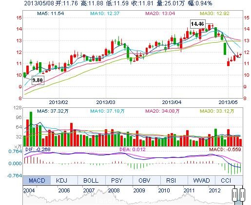 今開: 11.76 成交量: 25.01萬手 振幅: 2.48% 最高: 11.88 成交額: 2.93億元 換手率: 2.65% 最低: 11.59 總市值: 123.34億 市凈率: 3.56 昨收: 11.70 流通市值...