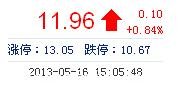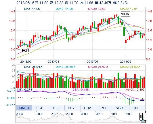 今開: 11.80 成交量: 43.49萬手 振幅: 5.31% 最高: 12.33 成交額: 5.25億元 換手率: 4.60% 最低: 11.70 總市值: 124.91億 市凈率: 3.60 昨收: 11.86 流通市值...