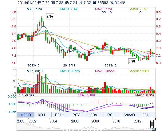今開: 7.29 成交量: 3.65萬手 振幅: 1.92% 最高: 7.38 成交額: 2673.89萬元 換手率: 0.84% 最低: 7.24 總市值: 31.97億 市凈率: 2.34 昨收: 7.31 流通市值: ...