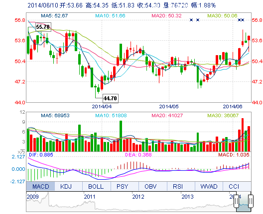 今開: 53.66 成交量: 7.67萬手 振幅: 4.73% 最高: 54.35 成交額: 4.08億元 換手率: 2.66% 最低: 51.83 總市值: 161.63億 市凈率: 9.73 昨收: 53.30 流通市值...