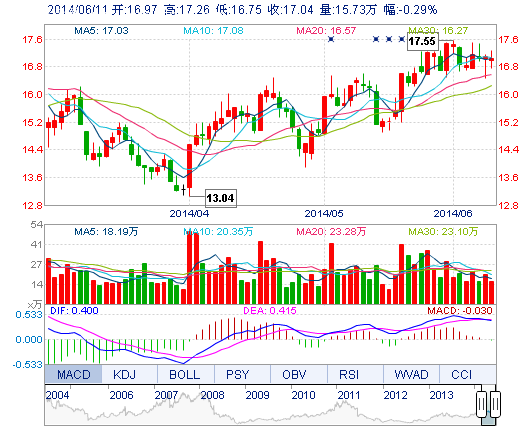 今開: 16.97 成交量: 15.73萬手 振幅: 2.98% 最高: 17.26 成交額: 2.68億元 換手率: 1.65% 最低: 16.75 總市值: 179.86億 市凈率: 4.88 昨收: 17.09 流通市值...