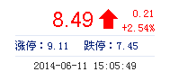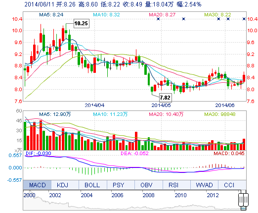 今開: 8.26 成交量: 18.04萬手 振幅: 4.59% 最高: 8.60 成交額: 1.53億元 換手率: 2.02% 最低: 8.22 總市值: 75.66億 市凈率: 2.83 昨收: 8.28 流通市值: 75...