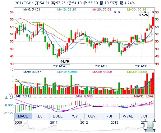 | 最 高: | 57.25 | 成交額: | 5.88億元 | 換手率: | 3.66% |