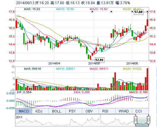 | 最 高: | 17.60 | 成交額: | 2.36億元 | 換手率: | 10.38% |