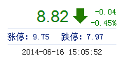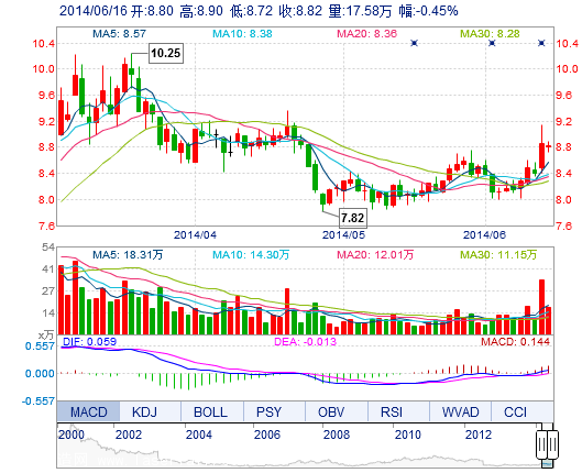 今開: 8.80 成交量: 17.58萬手 振幅: 2.03% 最高: 8.90 成交額: 1.55億元 換手率: 1.97% 最低: 8.72 總市值: 78.60億 市凈率: 2.94 昨收: 8.86 流通市值: 78...