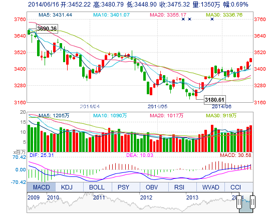 今開: 3452.23 最高: 3480.79 昨收: 3451.46 最低: 3448.90 成交量: 1349.64萬手 振幅: 0.92% 成交額: 196.53億元