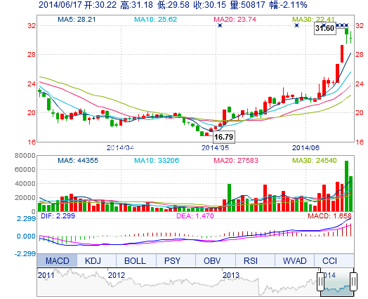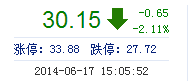 | 今 開: | 30.22 | 成交量: | 5.08萬手 | 振 幅: | 5.19% |
