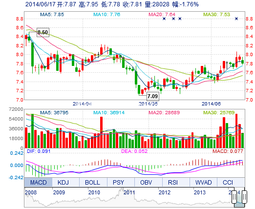 今開: 7.87 成交量: 2.80萬手 振幅: 2.14% 最高: 7.95 成交額: 2202.88萬元 換手率: 1.02% 最低: 7.78 總市值: 22.26億 市凈率: 3.47 昨收: 7.95 流通市值: ...