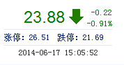 | 今 開: | 24.10 | 成交量: | 1.61萬手 | 振 幅: | 1.99% |