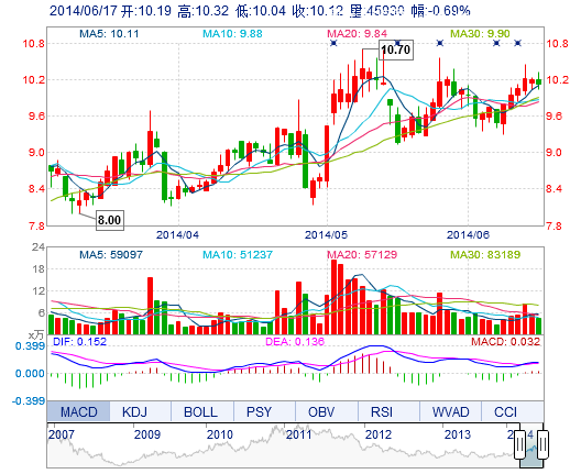 今開: 10.19 成交量: 4.59萬手 振幅: 2.75% 最高: 10.32 成交額: 4673.83萬元 換手率: 2.31% 最低: 10.04 總市值: 20.16億 市凈率: 4.07 昨收: 10.19 流通市...