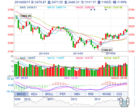 今開: 3470.87 最高: 3471.55 昨收: 3475.32 最低: 3440.31 成交量: 1186.09萬手 振幅: 0.90% 成交額: 179.58億元