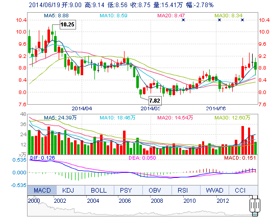 今開: 9.00 成交量: 15.41萬手 振幅: 6.44% 最高: 9.14 成交額: 1.36億元 換手率: 1.73% 最低: 8.56 總市值: 77.97億 市凈率: 2.91 昨收: 9.00 流通市值: 77...