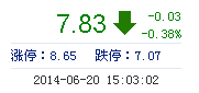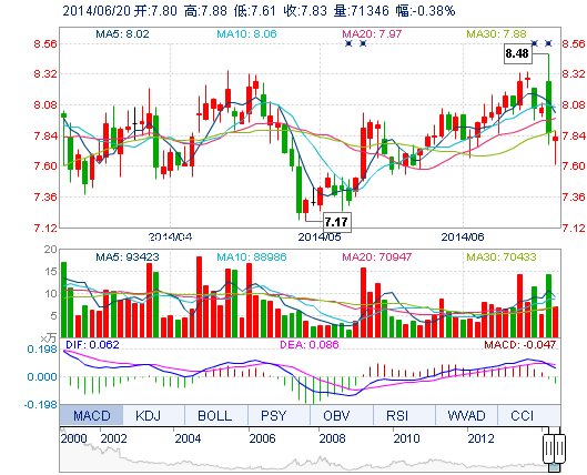 今開: 7.80 成交量: 7.13萬手 振幅: 3.44% 最高: 7.88 成交額: 5544.27萬元 換手率: 1.63% 最低: 7.61 總市值: 34.20億 市凈率: 2.46 昨收: 7.86 流通市值: ...