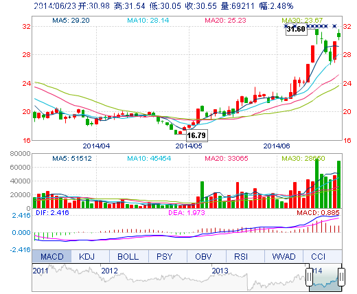 | 最 高: | 31.54 | 成交額: | 2.13億元 | 換手率: | 25.96% |
