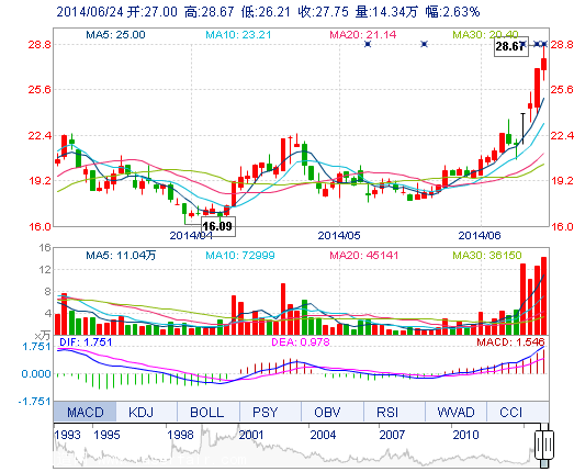 今開: 27.00 成交量: 14.34萬手 振幅: 9.10% 最高: 28.67 成交額: 3.91億元 換手率: 8.26% 最低: 26.21 總市值: 48.20億 市凈率: 13.94 昨收: 27.04 流通市值...