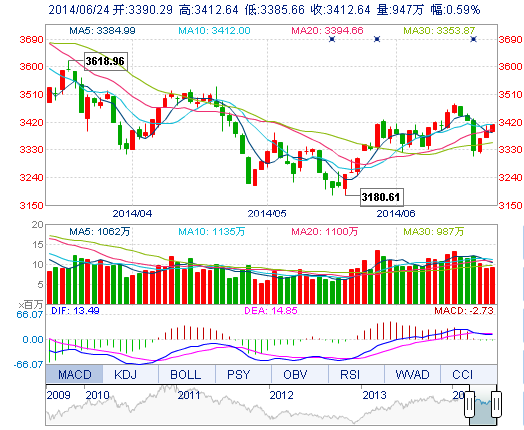 今開: 3390.29 最高: 3412.64 昨收: 3392.54 最低: 3385.67 成交量: 946.85萬手 振幅: 0.80% 成交額: 134.07億元