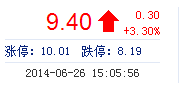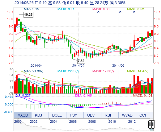 今開: 9.10 成交量: 28.24萬手 振幅: 5.71% 最高: 9.53 成交額: 2.63億元 換手率: 3.17% 最低: 9.01 總市值: 83.76億 市凈率: 3.13 昨收: 9.10 流通市值: 83...