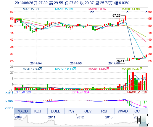 今開: 27.80 成交量: 25.72萬手 振幅: 6.32% 最高: 29.55 成交額: 7.41億元 換手率: 4.06% 最低: 27.80 總市值: 192.33億 市凈率: 5.26 昨收: 27.70 流通市值...