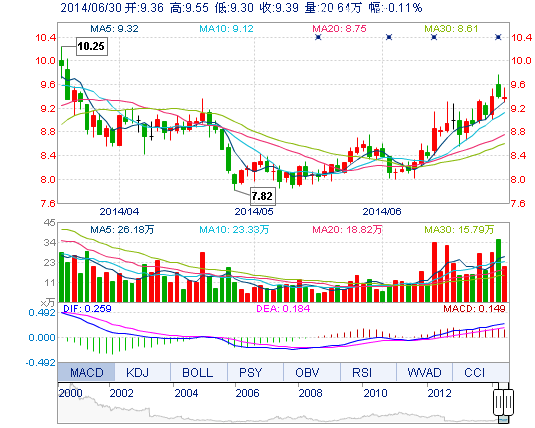 今開: 9.36 成交量: 20.64萬手 振幅: 2.66% 最高: 9.55 成交額: 1.94億元 換手率: 2.32% 最低: 9.30 總市值: 83.68億 市凈率: 3.13 昨收: 9.40 流通市值: 83...