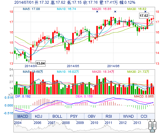 | 今 開: | 17.32 | 成交量: | 17.41萬手 | 振 幅: | 2.71% |