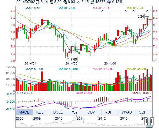| 今 開: | 8.14 | 成交量: | 4.86萬手 | 振 幅: | 2.09% |
