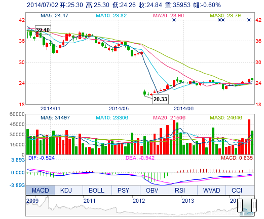 | 今 開: | 25.30 | 成交量: | 3.60萬手 | 振 幅: | 4.16% |