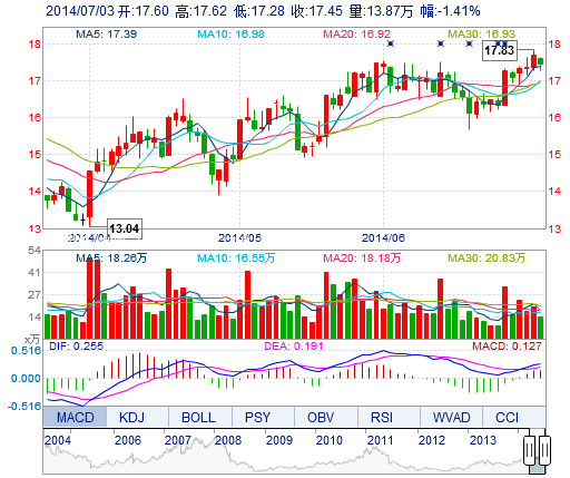 今開: 17.60 成交量: 13.87萬手 振幅: 1.92% 最高: 17.62 成交額: 2.42億元 換手率: 1.45% 最低: 17.28 總市值: 184.20億 市凈率: 5.00 昨收: 17.70 流通市值...