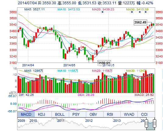 今開: 3550.30 最高: 3555.00 昨收: 3547.99 最低: 3531.53 成交量: 1222.74萬手 振幅: 0.66% 成交額: 192.02億元