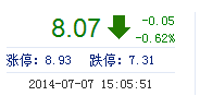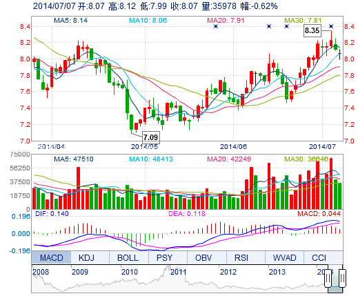 | 今 開: | 8.07 | 成交量: | 3.60萬手 | 振 幅: | 1.60% |