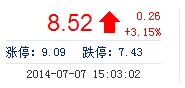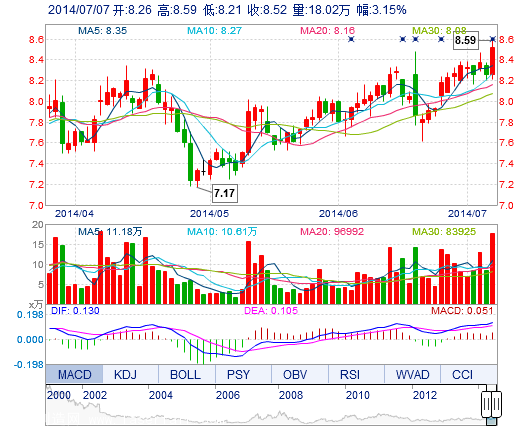 今開: 8.26 成交量: 18.02萬手 振幅: 4.60% 最高: 8.59 成交額: 1.52億元 換手率: 4.13% 最低: 8.21 總市值: 37.22億 市凈率: 2.67 昨收: 8.26 流通市值: 37...