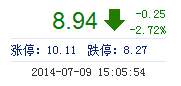 今開: 9.19 成交量: 21.20萬手 振幅: 2.94% 最高: 9.19 成交額: 1.92億元 換手率: 2.38% 最低: 8.92 總市值: 79.67億 市凈率: 2.98 昨收: 9.19 流通市值: 79...