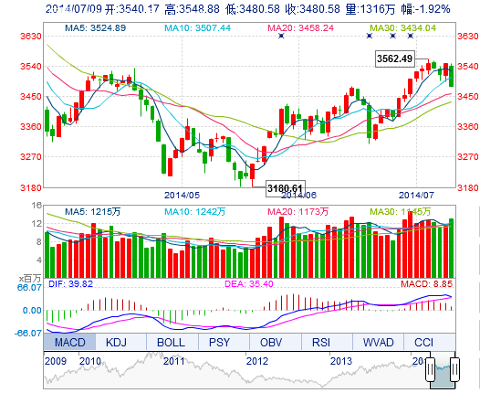 今開(kāi): 3540.17 最高: 3548.88 昨收: 3548.77 最低: 3480.58 成交量: 1316.37萬(wàn)手 振幅: 1.92% 成交額: 234.52億元