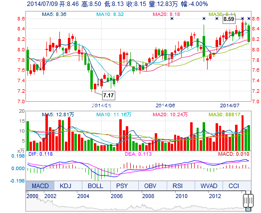| 今 開: | 8.46 | 成交量: | 12.83萬手 | 振 幅: | 4.36% |