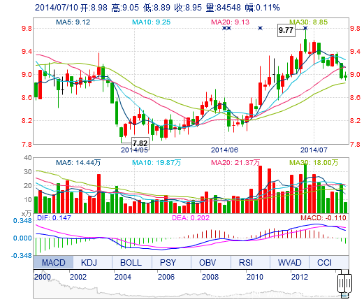 今開: 8.98 成交量: 8.45萬手 振幅: 1.79% 最高: 9.05 成交額: 7582.45萬元 換手率: 0.95% 最低: 8.89 總市值: 79.75億 市凈率: 2.98 昨收: 8.94 流通市值: ...