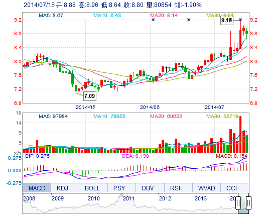 | 今 開: | 8.88 | 成交量: | 8.09萬手 | 振 幅: | 3.57% |