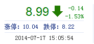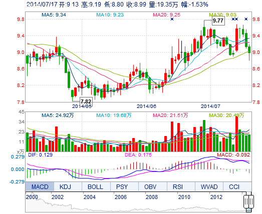 今開: 9.13 成交量: 19.35萬手 振幅: 4.27% 最高: 9.19 成交額: 1.74億元 換手率: 2.17% 最低: 8.80 總市值: 80.11億 市凈率: 2.99 昨收: 9.13 流通市值: 80...