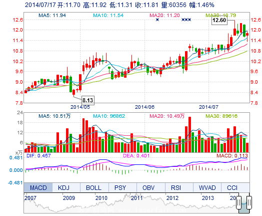 今開: 11.70 成交量: 6.04萬手 振幅: 5.24% 最高: 11.92 成交額: 7053.93萬元 換手率: 3.03% 最低: 11.31 總市值: 23.53億 市凈率: 4.75 昨收: 11.64 流通市...