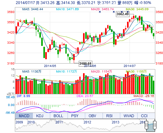 今開: 3413.26 最高: 3414.30 昨收: 3418.73 最低: 3370.21 成交量: 869.48萬手 振幅: 1.29% 成交額: 143.01億元