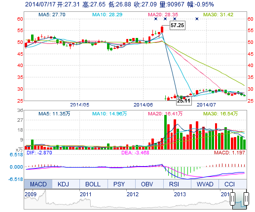 今開: 27.31 成交量: 9.10萬手 振幅: 2.82% 最高: 27.65 成交額: 2.47億元 換手率: 1.43% 最低: 26.88 總市值: 177.40億 市凈率: 4.85 昨收: 27.35 流通市值...