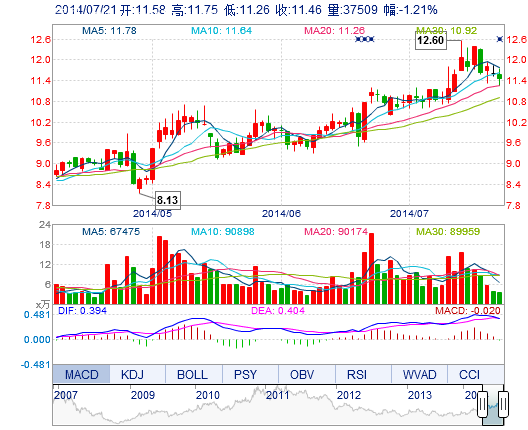 | 今 開: | 11.58 | 成交量: | 3.75萬手 | 振 幅: | 4.22% |