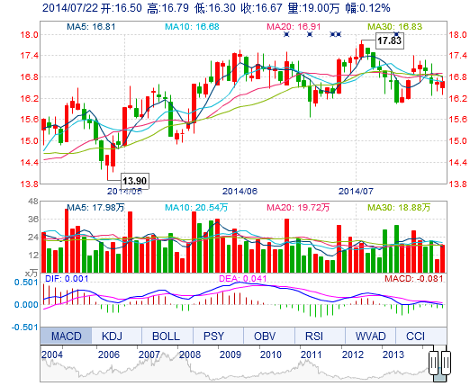 今開: 16.50 成交量: 19.00萬手 振幅: 2.94% 最高: 16.79 成交額: 3.16億元 換手率: 1.99% 最低: 16.30 總市值: 175.96億 市凈率: 4.77 昨收: 16.65 流通市值...