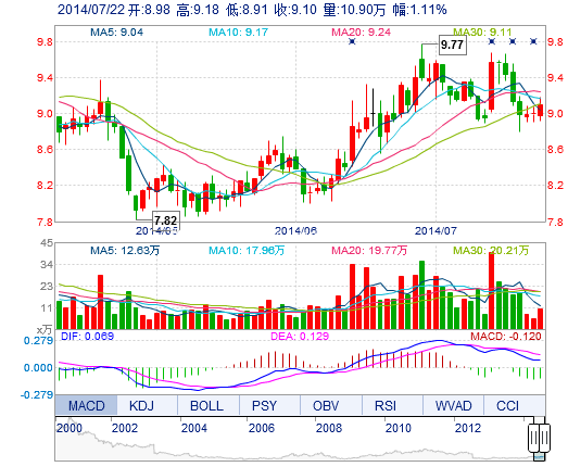 今開: 8.98 成交量: 10.90萬手 振幅: 3.00% 最高: 9.18 成交額: 9869.05萬元 換手率: 1.22% 最低: 8.91 總市值: 81.09億 市凈率: 3.03 昨收: 9.00 流通市值:...