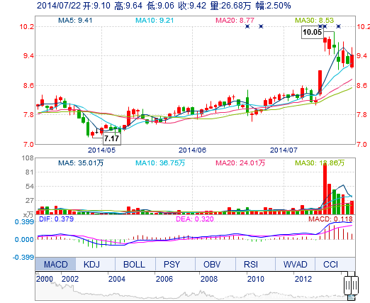 今開: 9.10 成交量: 26.68萬手 振幅: 6.31% 最高: 9.64 成交額: 2.50億元 換手率: 6.11% 最低: 9.06 總市值: 41.15億 市凈率: 2.95 昨收: 9.19 流通市值: 41...