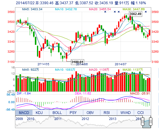 今開: 3390.46 最高: 3437.37 昨收: 3396.05 最低: 3387.52 成交量: 911.09萬手 振幅: 1.47% 成交額: 154.10億元